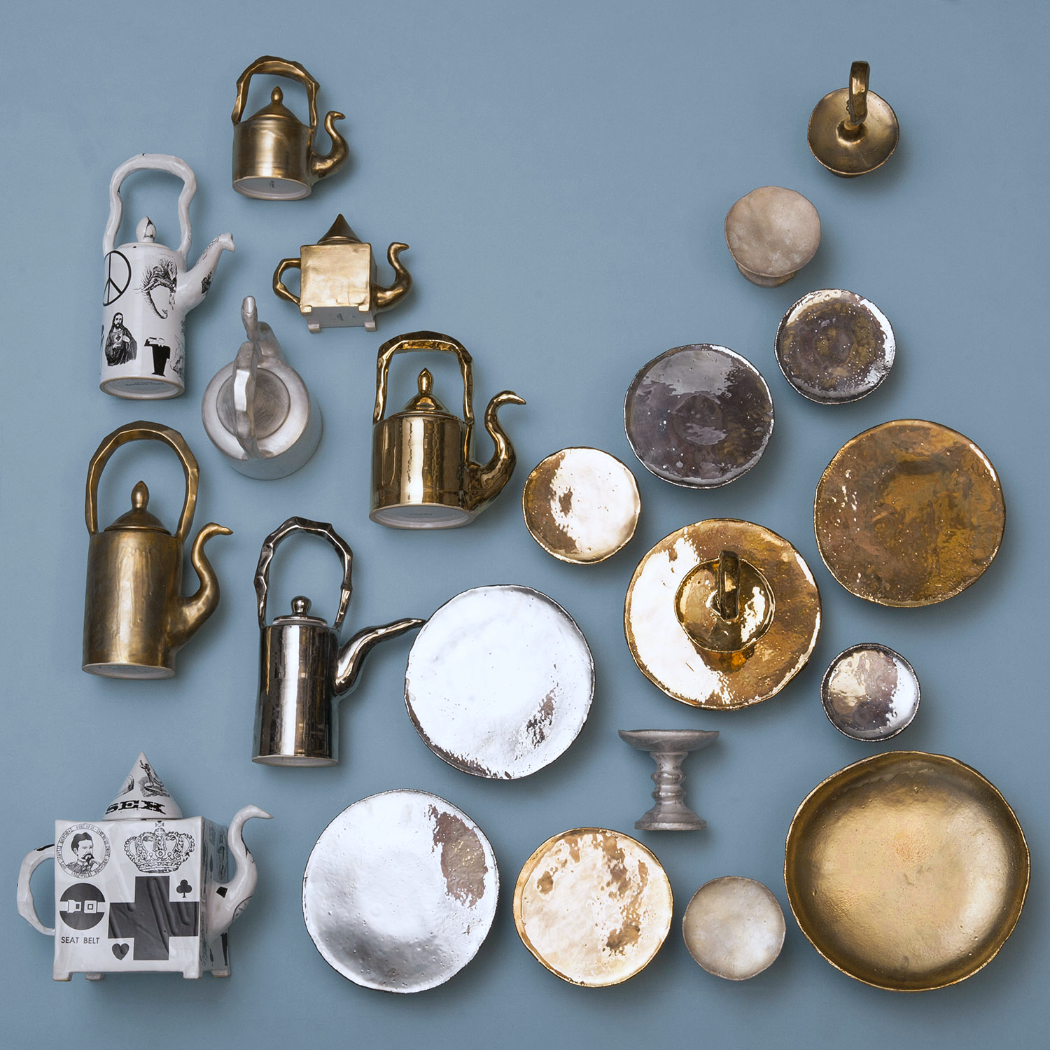Material: Steingut, farbige Glasuren oder mit einer Auflage aus echtem Gold oder Platin ('Glam', 'de Luxe')